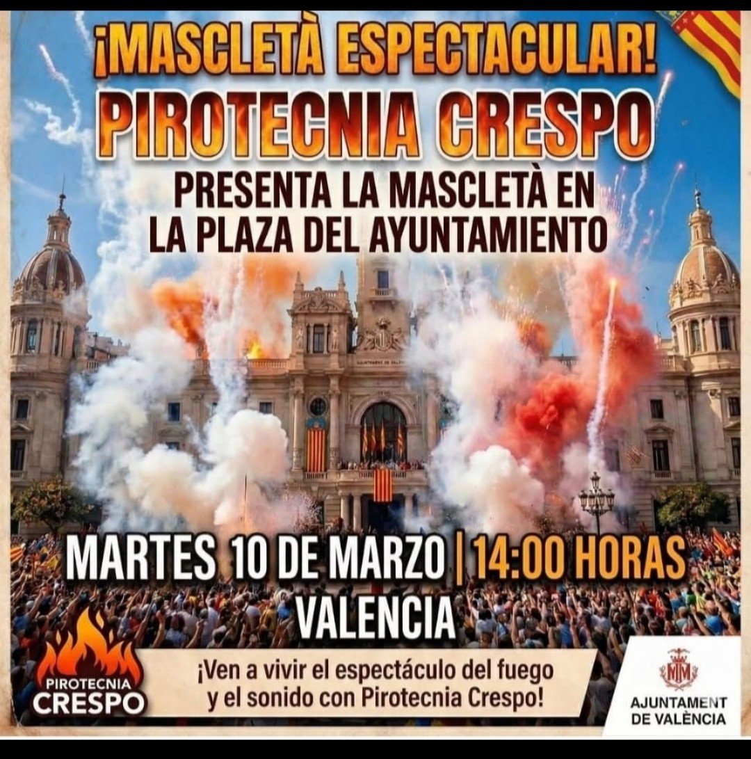 La Pirotecnia Crespo de Alzira disparará la mascletá del dia 10 de Marzo en la Plaza del Ayuntamiento de Valencia.
